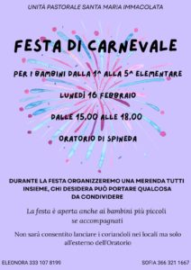 Lunedì 16 febbraio 2026, in occasione della festa di Carnevale gli oratori di Cividale e Spineda organizzano due feste per i ragazzi delle elementari e delle medie: